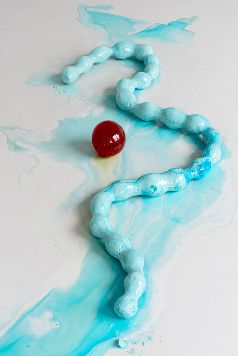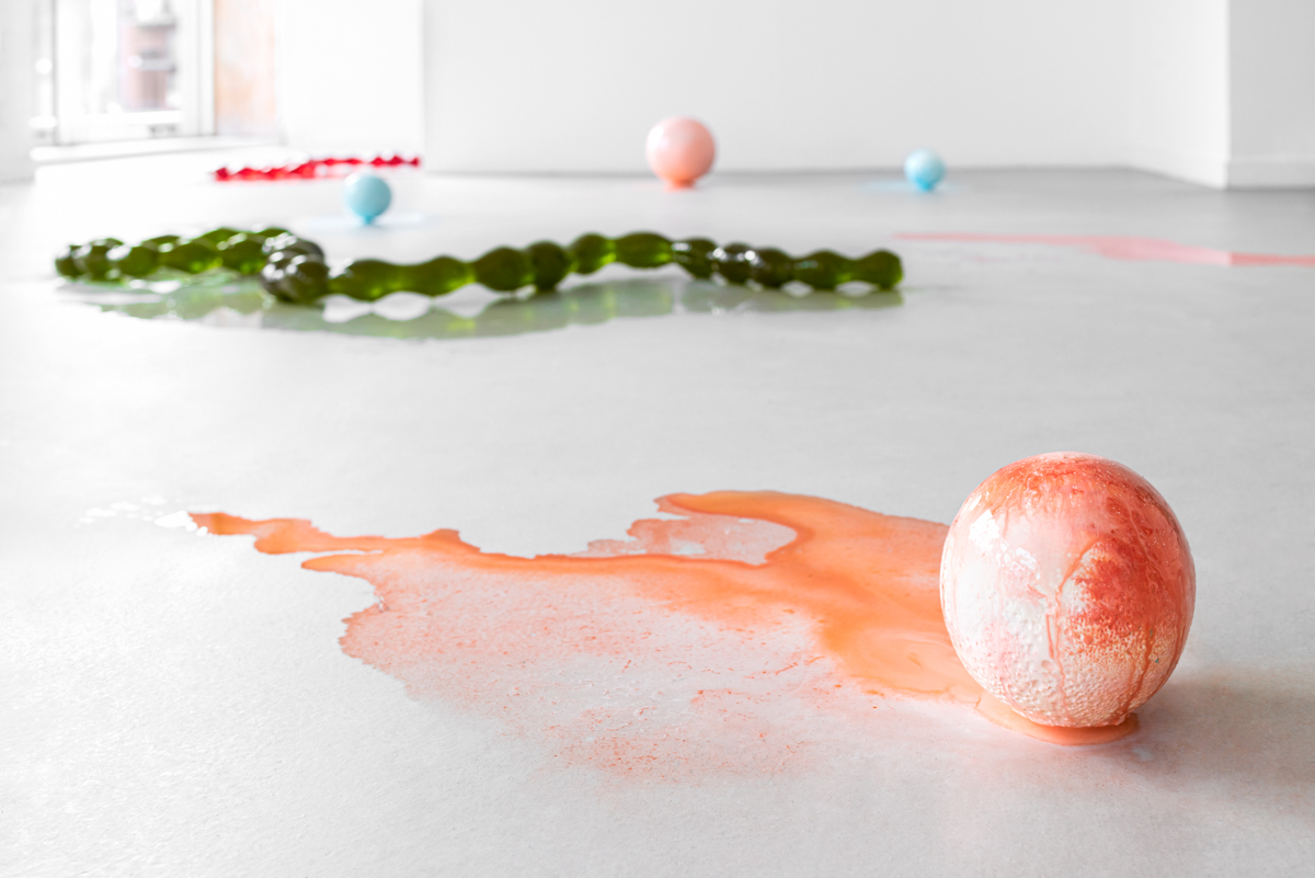 The process of creation is important to Blom, but it seldom features in the exposition of her work. “It doesn’t always show. Or it doesn’t show at all,” Blom says. “Whether to show more of the process, to do it, not to do it, and how to do it?” are questions that are always present in Blom’s investigations. “Sometimes the process is so fascinating. But I’m sometimes not so sure what there is for the viewer or what they need to know,” she states. Working with time-based material is a process of not only building up but breaking down, too. Over the past two months as artist-in-residence at Lademoen kunstnerverksteder, Blom has been spraying hard candy shapes with water every day. “There is something about building a sculpture that is so fragile that it will break down,” she says. Perhaps diluting these works over time is a way to explore fragility or to be whole in a different way. The contact with water quickly changes the material. It dilutes and spreads over its connecting surfaces. “It can be almost painful watching it change,” Blom states. “For a long time I tried to save [the works] or to preserve them somehow,” she adds. Now their presence spreads to wherever the watered-down candy has reached, organically along winding grooves, along table edges or on the floor. “In the beginning it felt fake, but now it has become my favourite part of the day, to spray [the works] with boiling water,” she says.