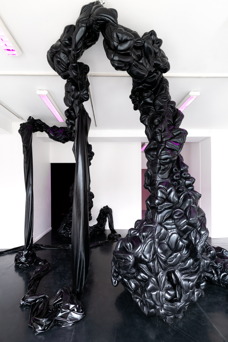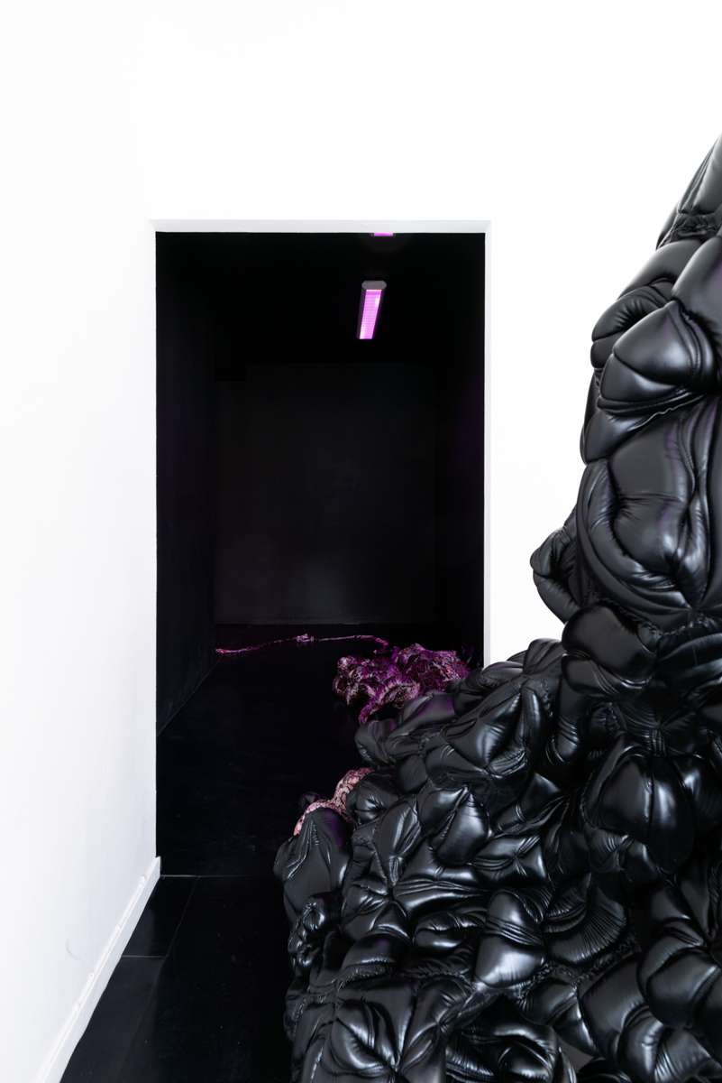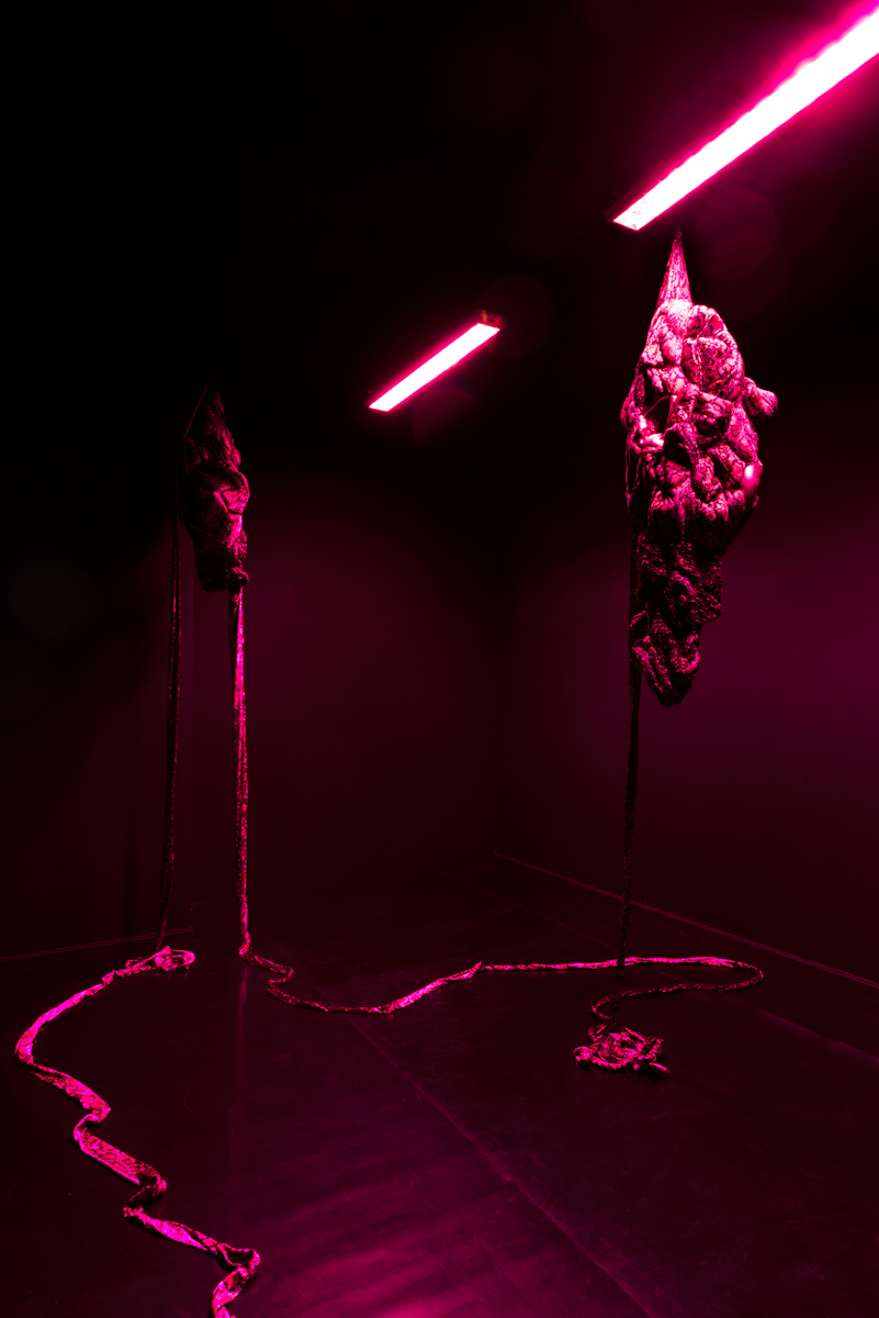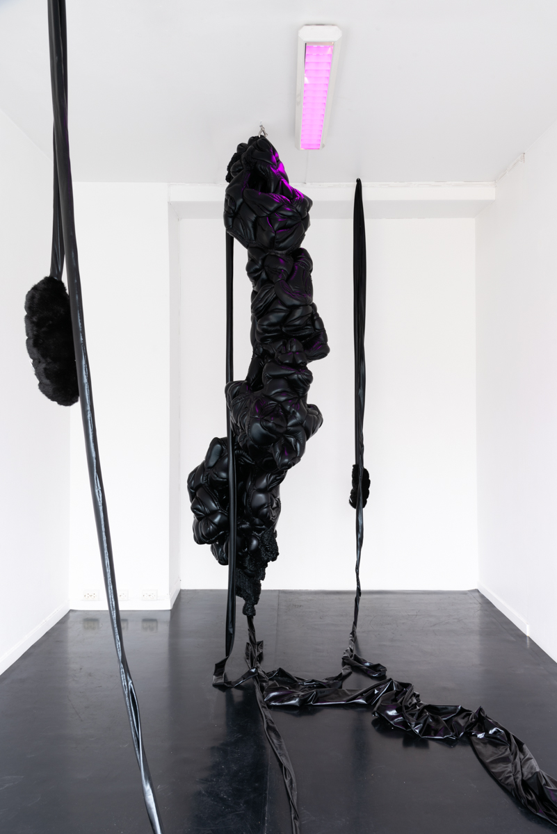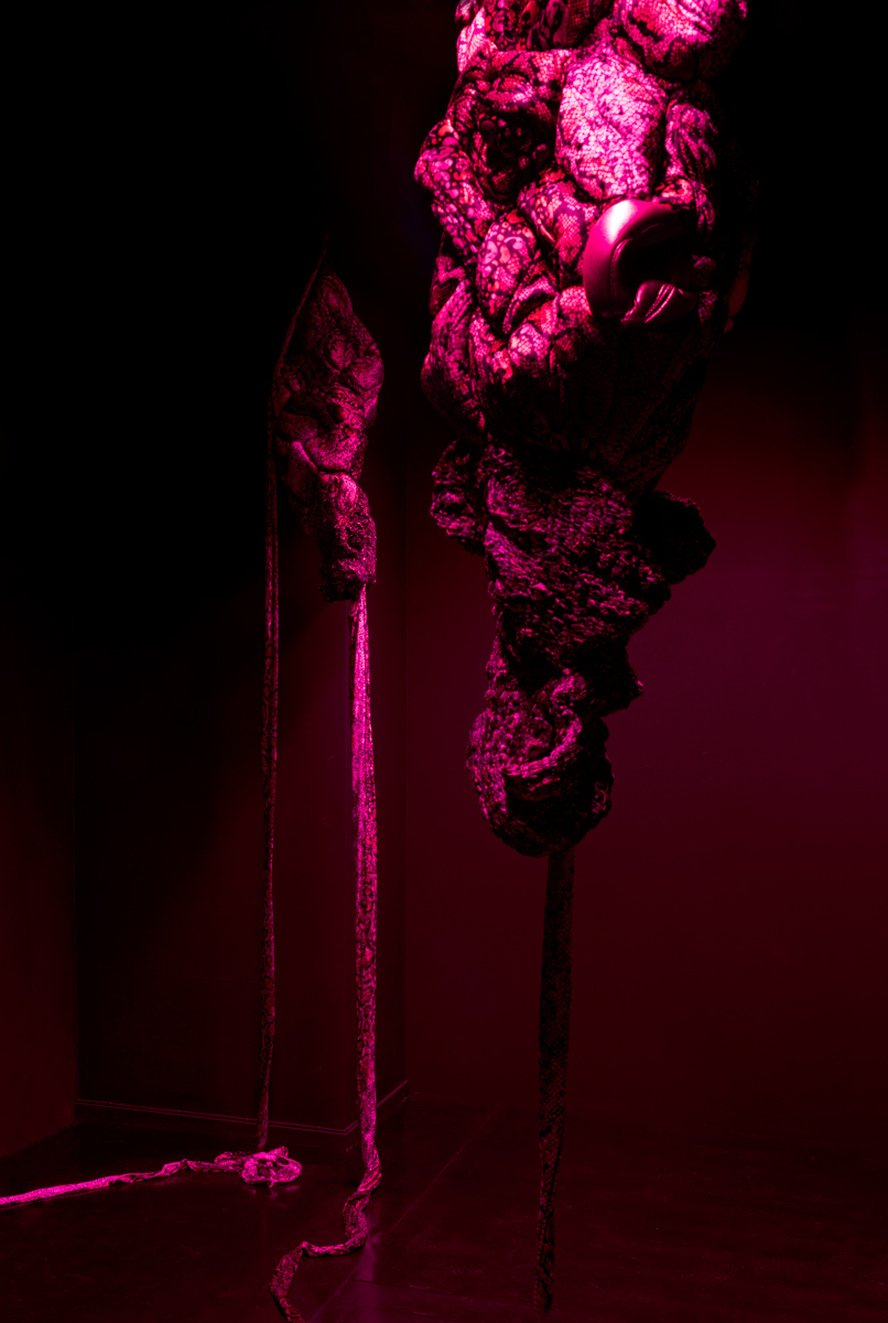 In the exhibition I DINE ARMER, Pia Antonsen Rognes shows textile sculpture forms that fill the entire exhibition space. Fused forms of glossy black textile and snakeskin-patterned velour fabric in pink colors grow both outwards and inwards in their own form and give associations to scarred skin and decay. The sculpture slither from the ceiling down to the floor where it meets black smelly rubber. For the occasion, Babel’s black box has been transformed into a growth chamber flooded with pink lights.