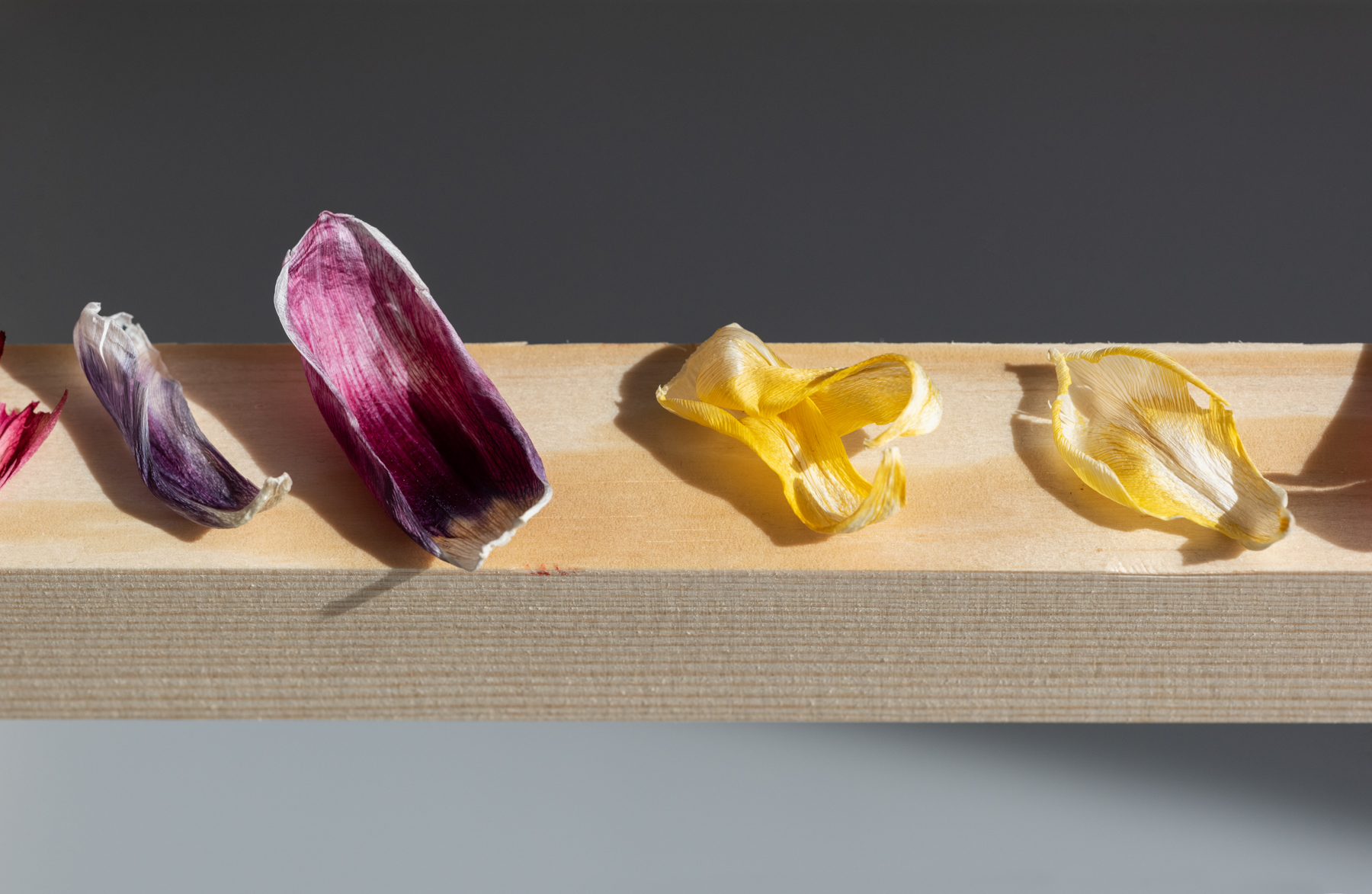 One of my favorite works by Karoline Sætre is the work Gammelvollen shown in her master exhibition at the Malmö Academy of the Arts a few years ago. On both sides of an end wall stood two platforms of moss; on one a rifle bullet and on the other the tooth of a moose, both resting on small cubes of glass. I remember the intense smell of moss ripping through my nostrils – and from it, water droplets that evaporated and clung to the glass. The sensory impressions evoked the experience of being present at the actual event, but as a physical manifestation of the splicing that distances memories from reality, the architecture of the space became a boundary that blocked our sight and prevented us from studying the objects from more than one perspective at a time – as the moose or as the hunter. If a moose, against all odds, were to get lost and step inside to see Karoline Sætre’s current exhibition at Babel, the various shades of burgundy, pink and neon orange would melt into, for the moose, more recognizable shades of brown. But what the moose lacks in color vision it makes up for with its wide field of view; its eyes practically placed on the side of its head look both to its side, its front and behind it at the same time. In other words, if you ever meet a moose, it is very likely that it saw you first.