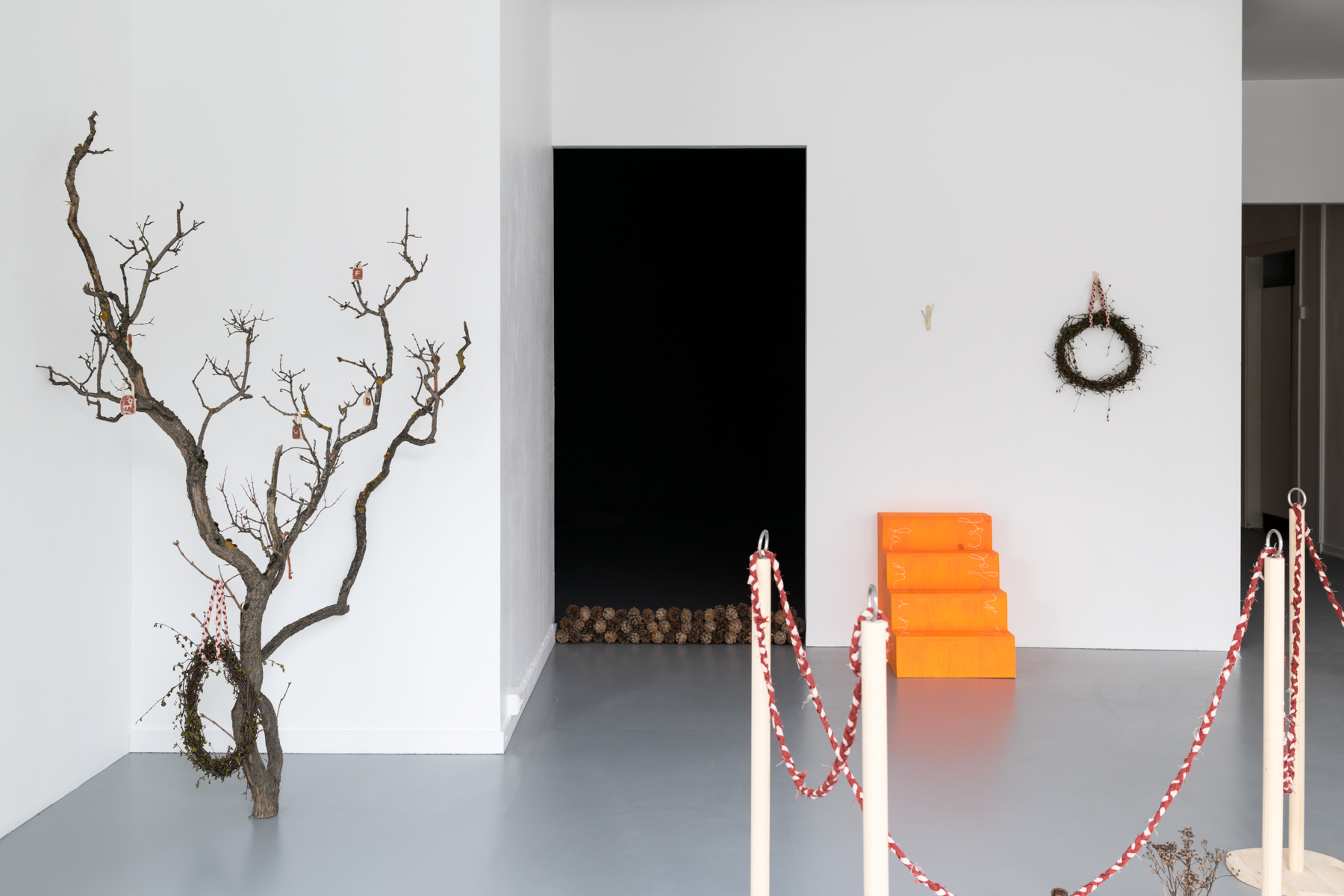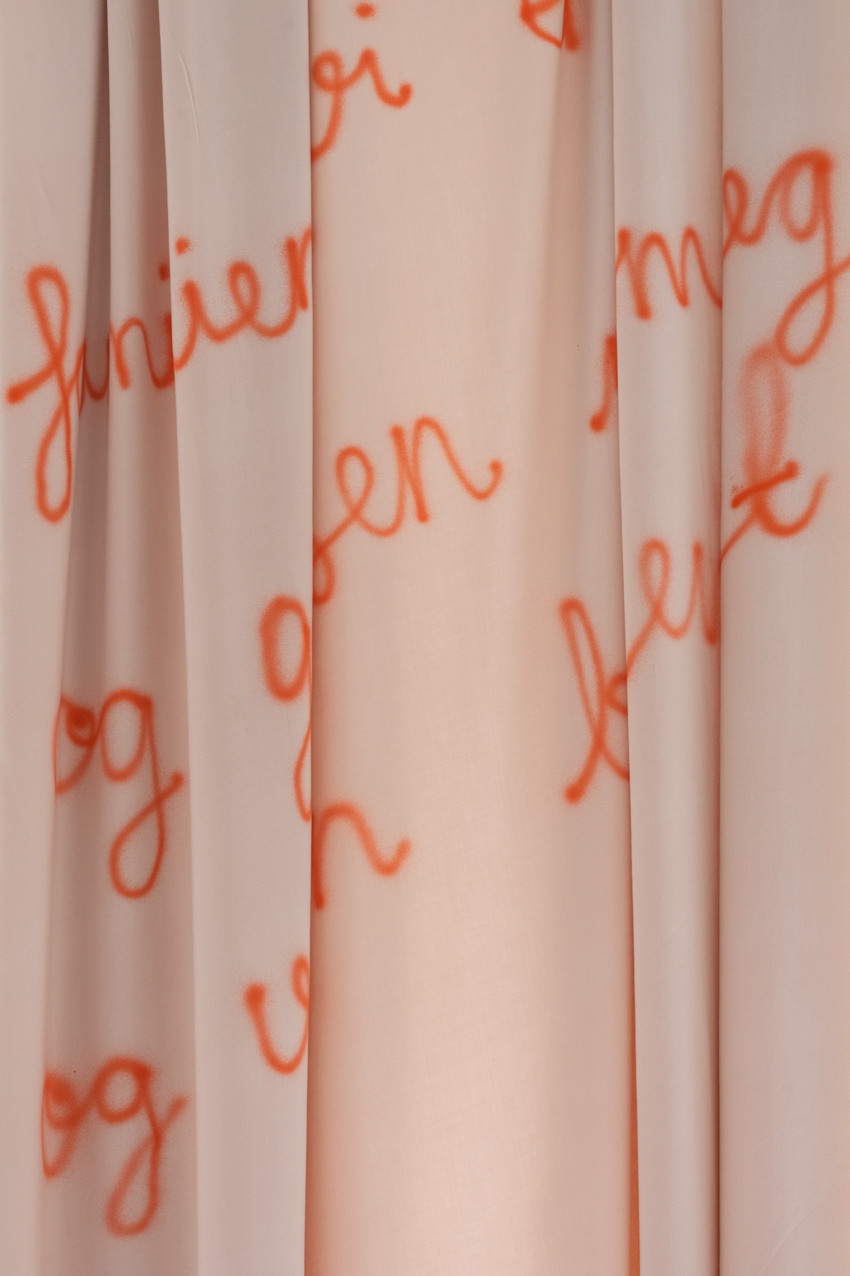 “JEG FØLER MELLOM OG I” is an exhibition consisting of a number of potential boundaries. Two soft walls stand and block free passage and false stairs lead into nothing. The works have been developed as a reaction to the urban space, which the artist has experienced through a residency at LKV in recent weeks. The exhibition is a personal abstraction of the emotions that arise in the face of physical and metaphorical boundaries of space. The poetic narrative lies as a potential key to the constructed landscape and the works refer to various more or less associative boundaries in the city.