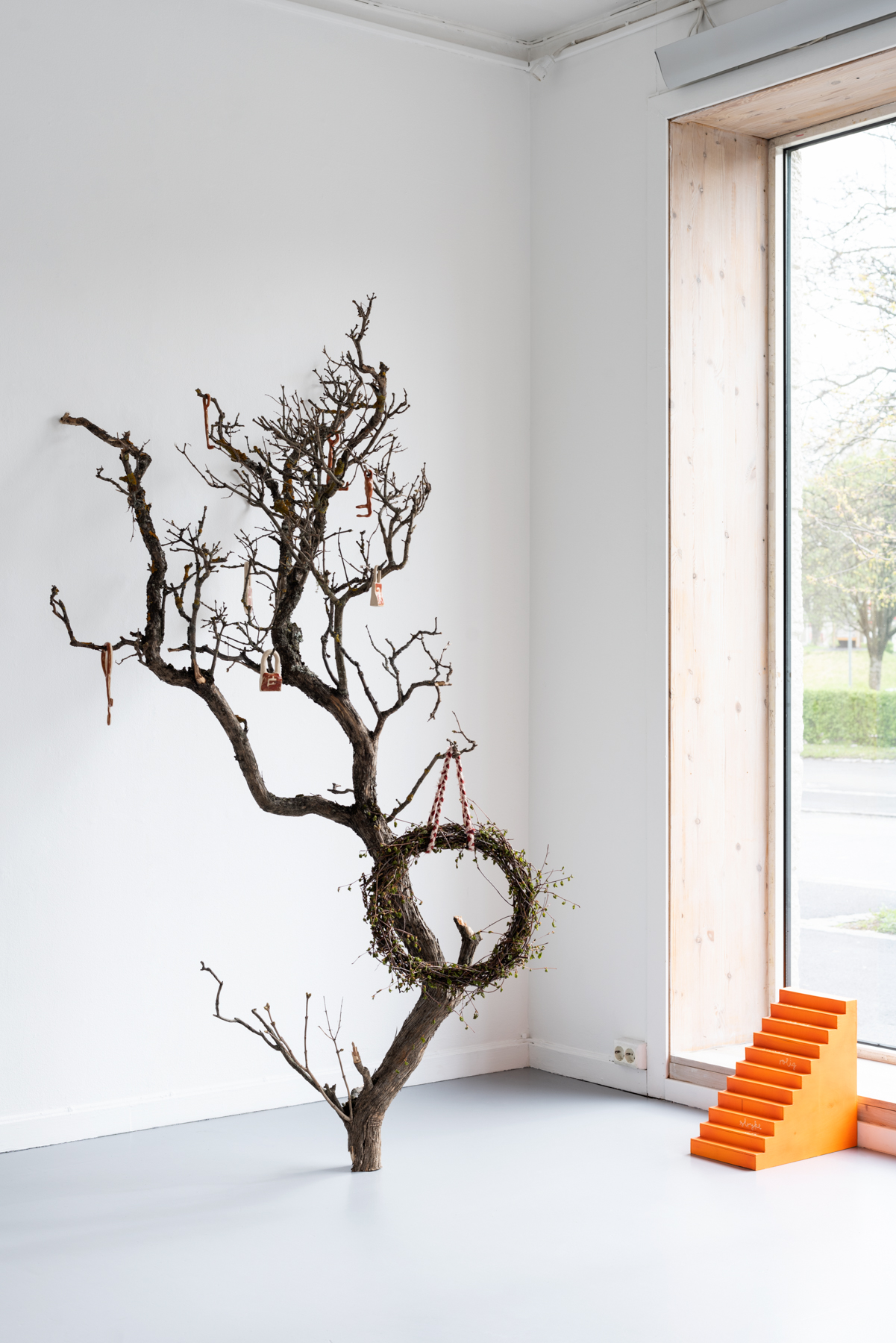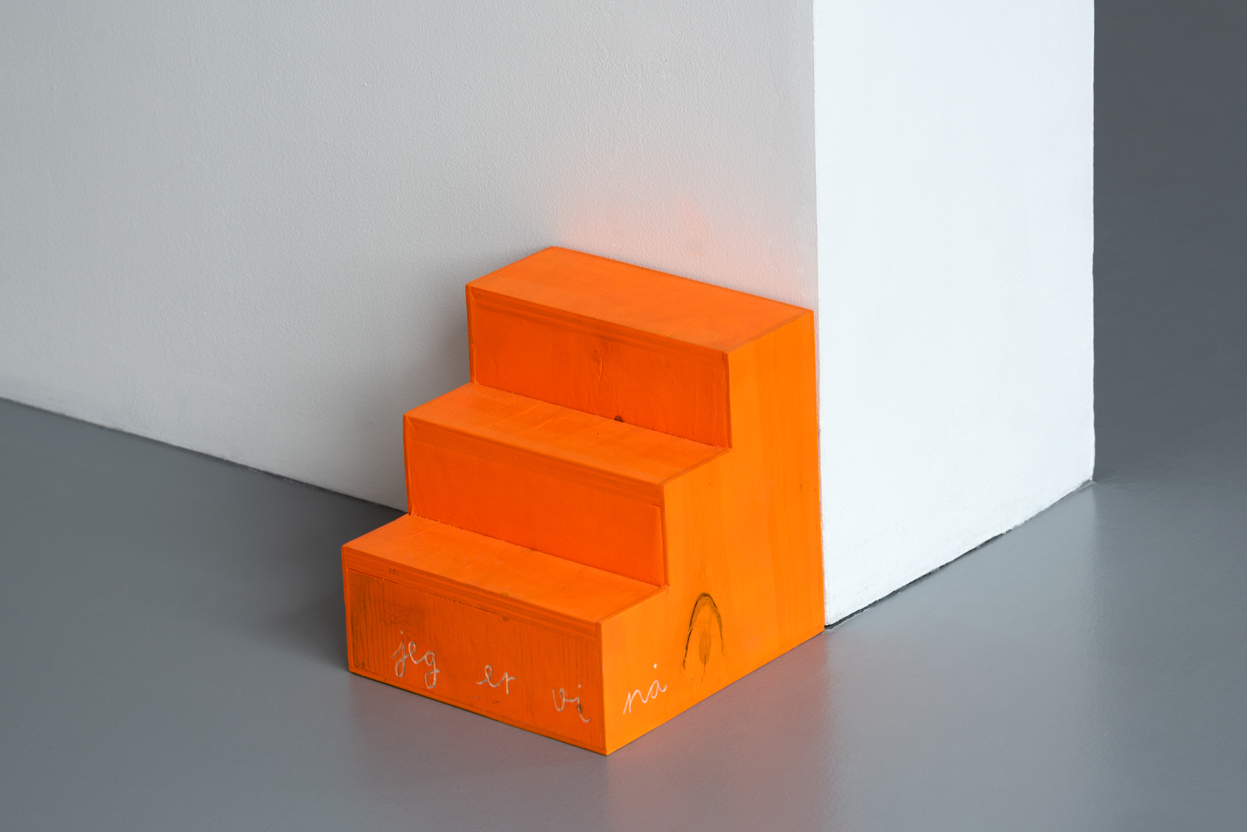The immediate overview from up there in the skyscraper is not offered to us in Karoline Sætre’s exhibition at Babel – because it is on the ground, in the language and text down here, that Karoline Sætre operates. Past and between walls we must use our body and navigate – among associative assemblages of objects, temporary structures, and urban alerts and obstacles such as keys, flags, locks, stairs and ropes. This seems to be the grammar of urban space; clearly pronounced by the luminous surfaces of the stairs in neon-orange, as decisive exclamation marks in the landscape (be warned!). But in these a duality is also communicated; on the one hand as a symbolic obstacle, on the other as a beckoning function; that which leads the way, upward, forward, inward. In the sound work that permeates the air of the exhibition, there is talk of “taking the right detour“, and it is as de Certeau insinuates precisely the choice between here or thereiv that creates the urban space for us – and it is in this doubt that Karoline Sætre lets us linger.