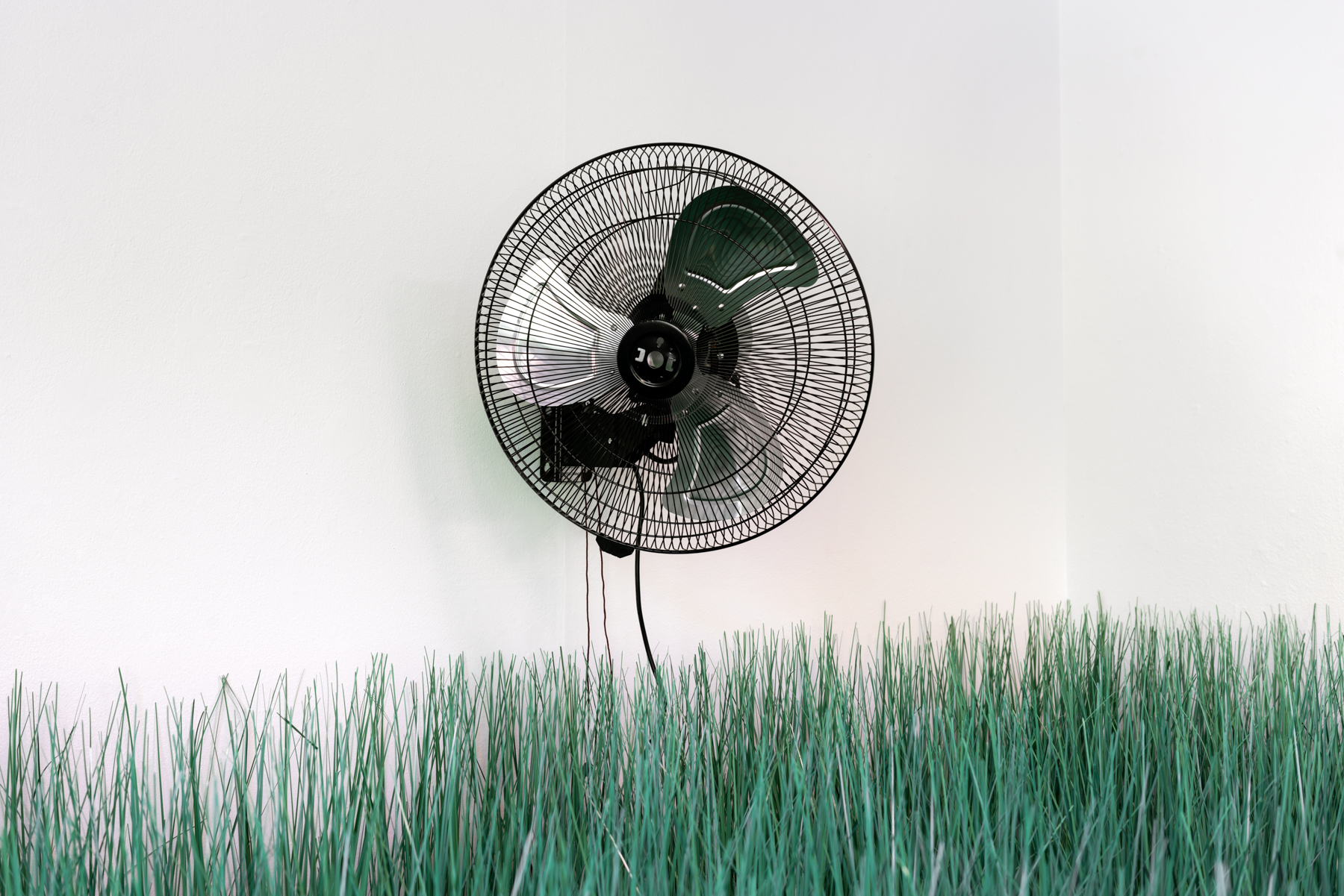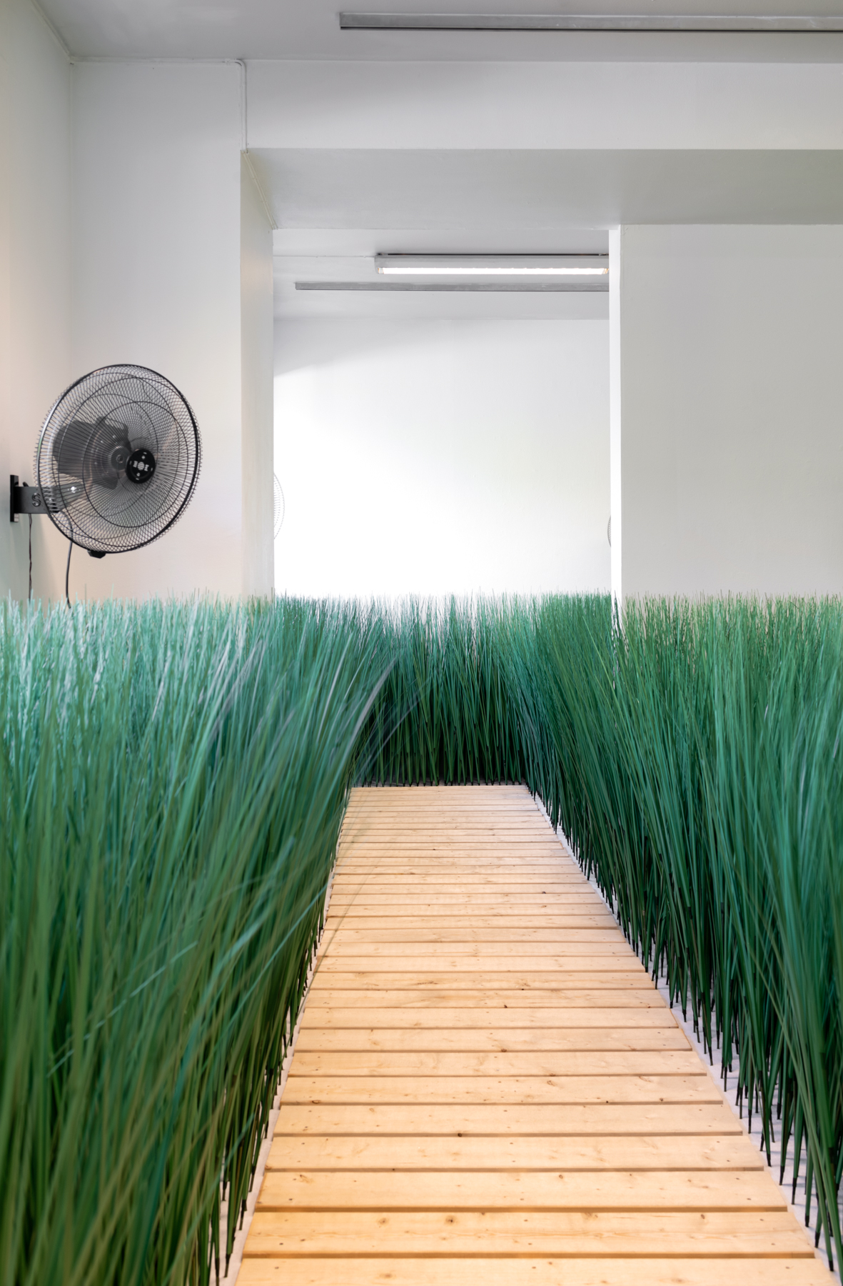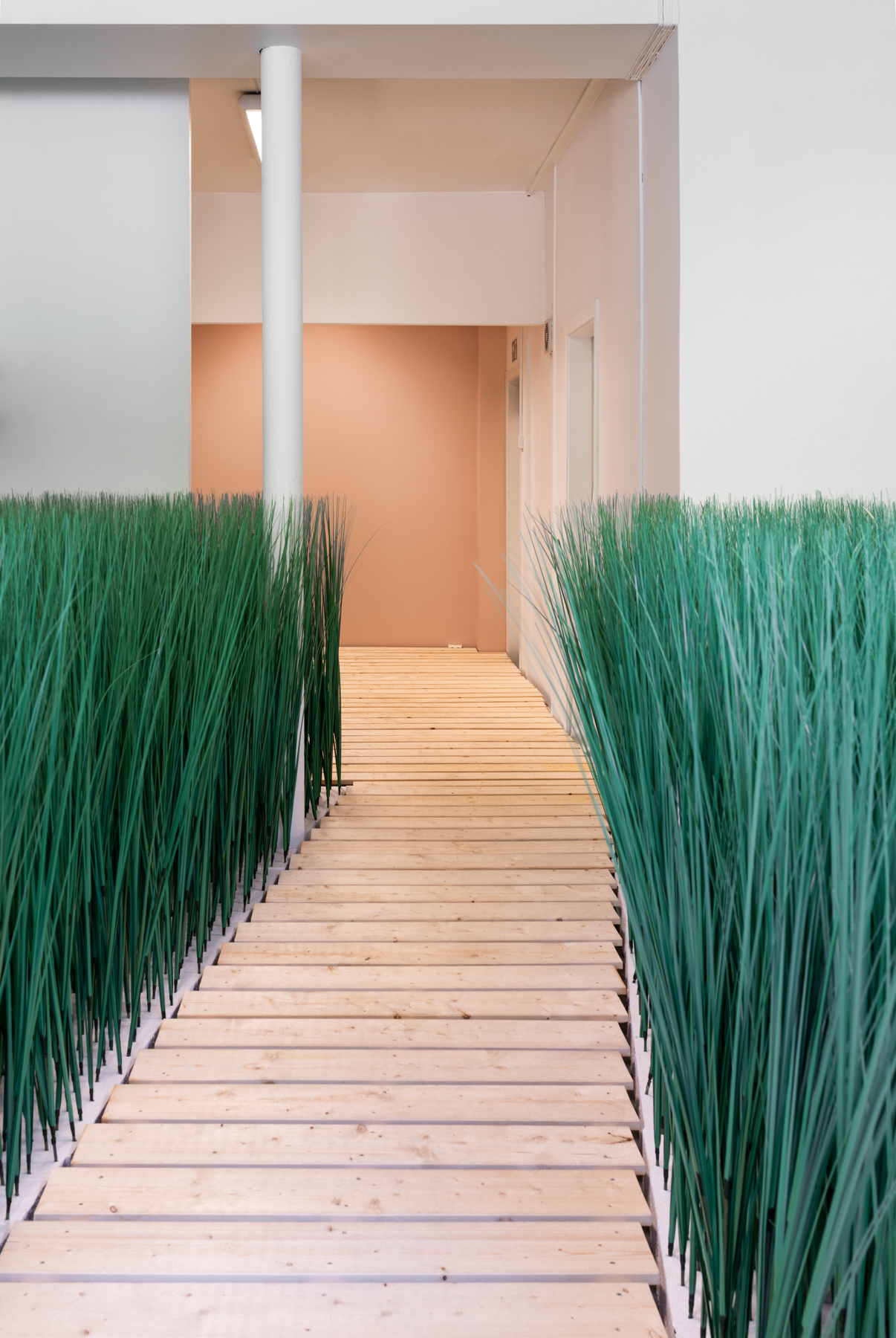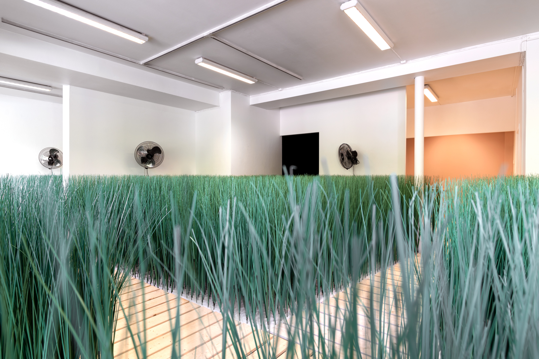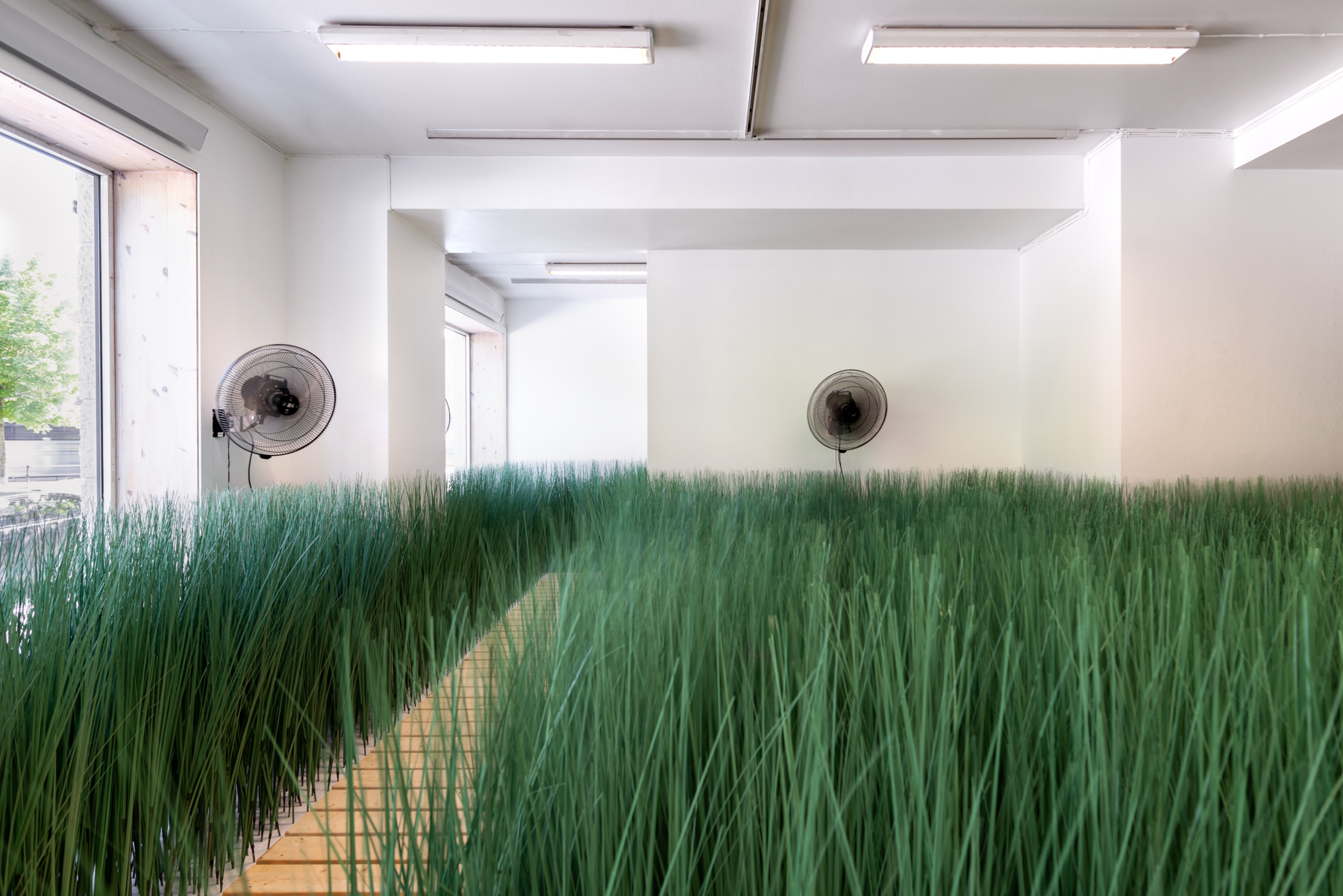 Crossed by wooden walkways, thousands of blades of artificial grass bend in artificial winds. As a world within worlds, plot / plott is an invitation to experience a connected but alternate environment creating an echo of the interior landscape with the exterior green of Lademoen park. The large-format installation presents a situation where the boundary between real and manufactured dissolves and reappears in constant dialogue.