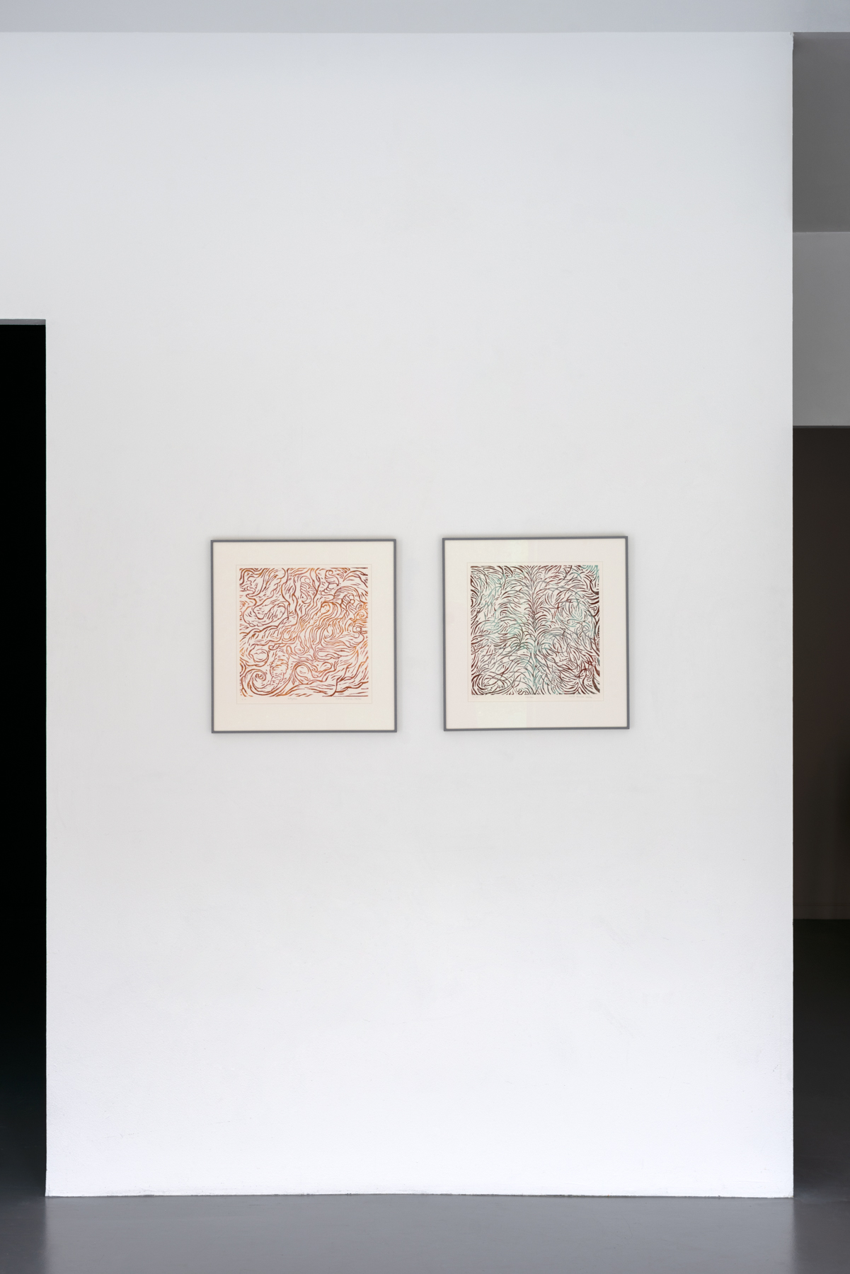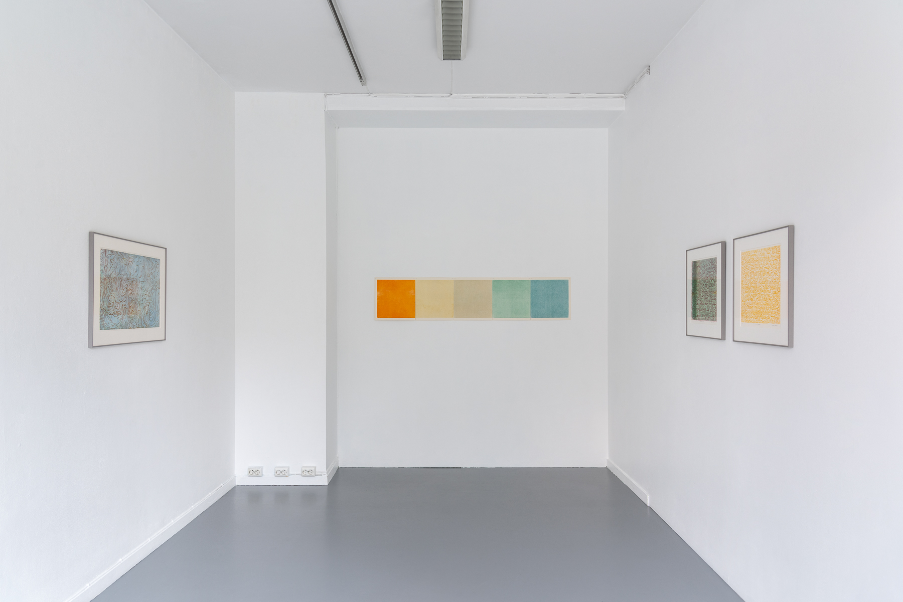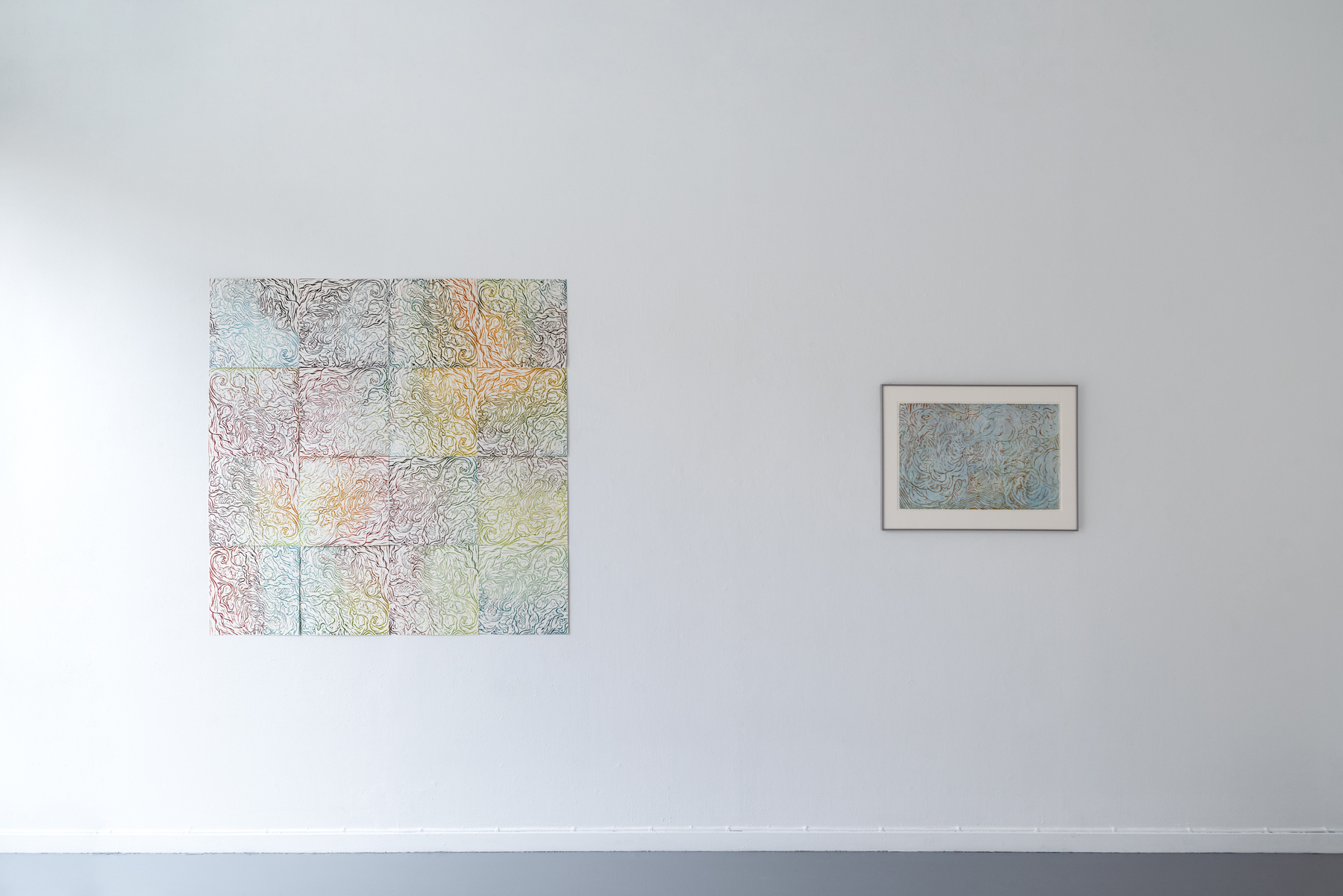 In the exhibition Linjerna i landskapet, Aronsson-Towler presents woodcuts that she has been working with for the past two years. From ten wooden plates, she has printed a large number of images, all unique in their colour combinations. The images are abstract and are based on both the grain of the wooden boards and patterns selected from everyday life. They are square and can be combined with any of the other images, rotated in any way. This results in a playful composition, and reflects an experience of thoughts being dynamic and fragmentary, connecting in unexpected ways. Included in the exhibition is a new artist’s book containing diary notes from Märit’s walks. An audio recording of these notes can be listened to in one of the gallery rooms.