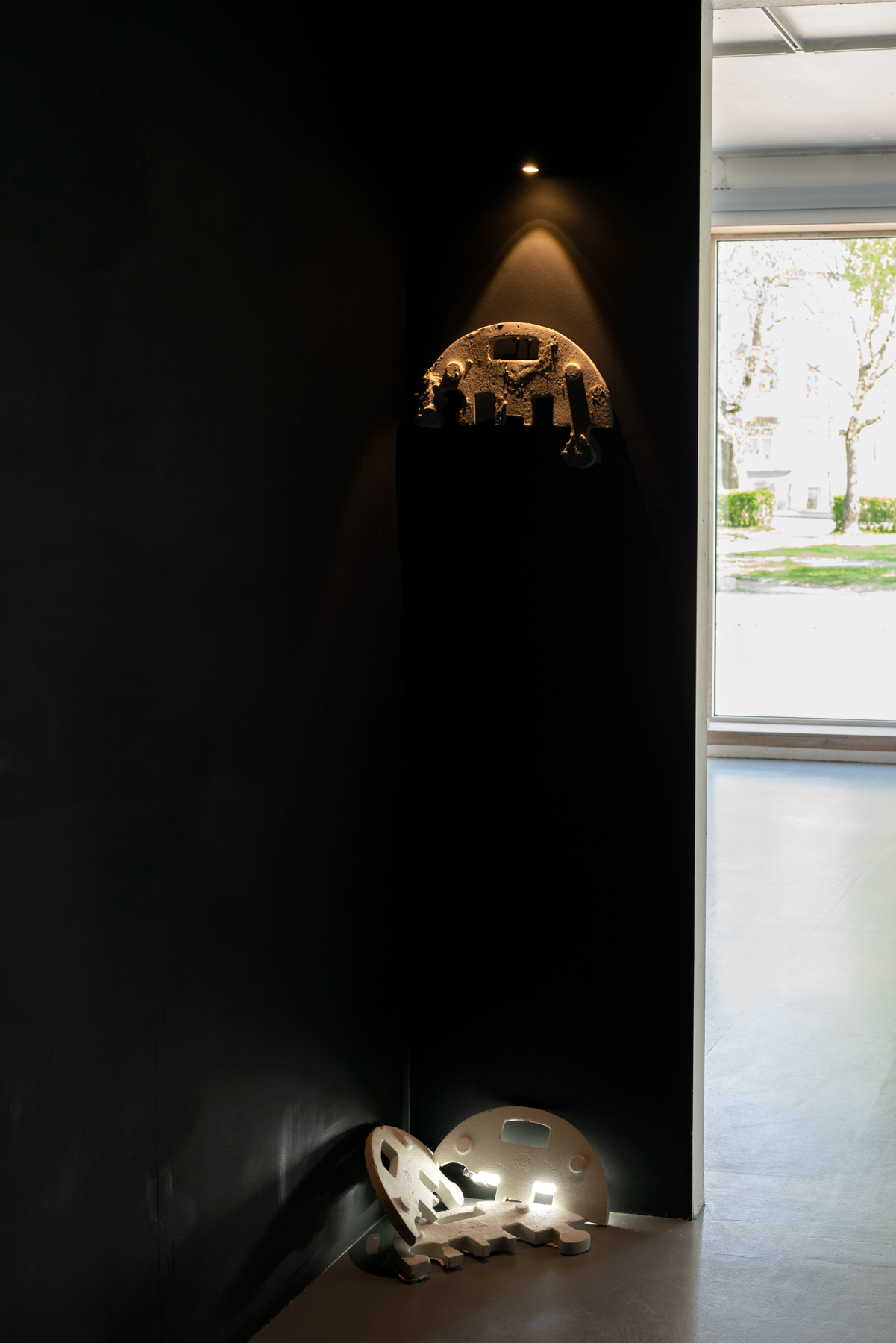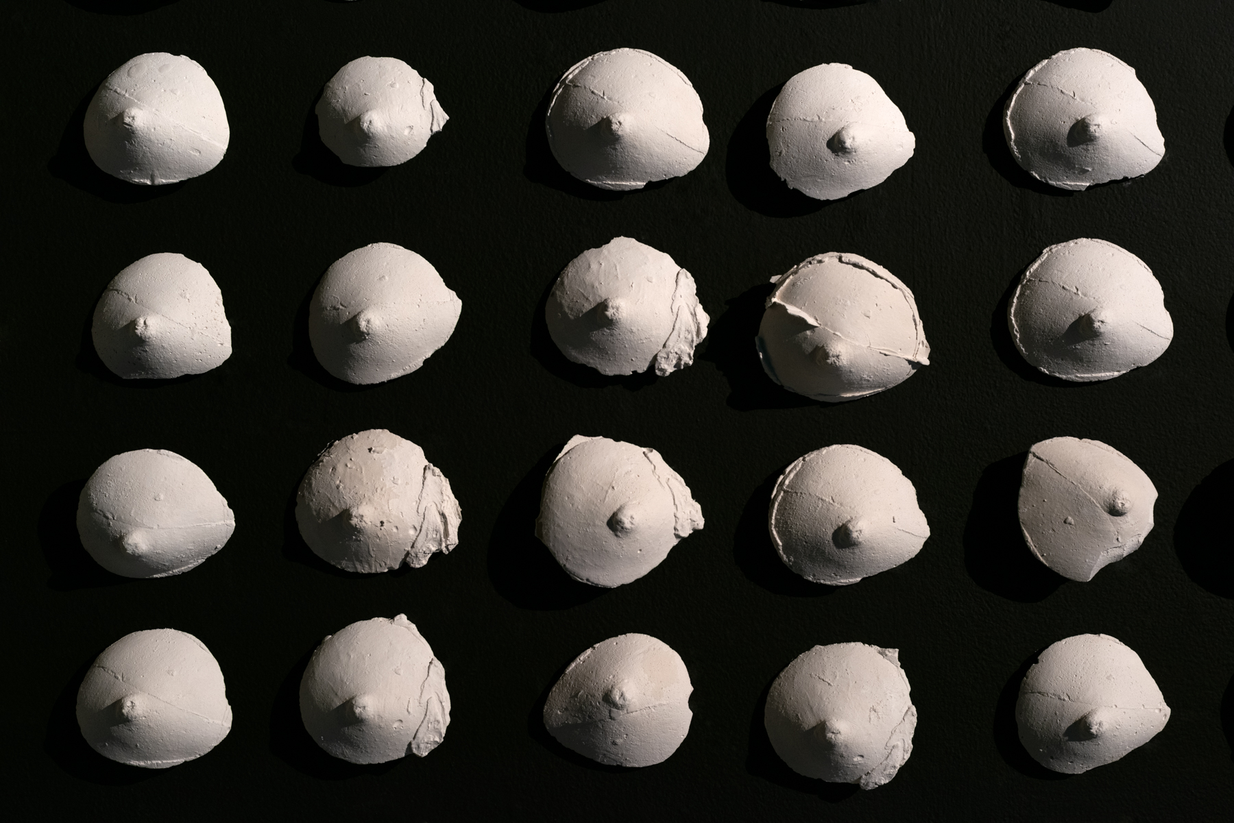 Time unfurls and folds as you step within the confines of the black box at BABEL visingsrom for kunst, an installation comprised of two thousand, two hundred and forty white plaster casts of the artists’ breasts. These breasts were modeled by the artist during her foundation year before entering the art academy, embodying her younger self and serving as the muse and guide for this exhibition. Rudjord, in her artistic exploration, communes with herself to delve into a range of themes revolving around women and the enduring archetypes that persist in our contemporary world. The commanding presence of Rudjord’s breasts exerts a powerful control over the space, creating a trompe-l’œil effect that confronts any attempt to objectify her sexuality with sheer force. This space acts as a bridge across time, allowing Rudjord to venture with her muse into an exploration of the realities experienced by women.