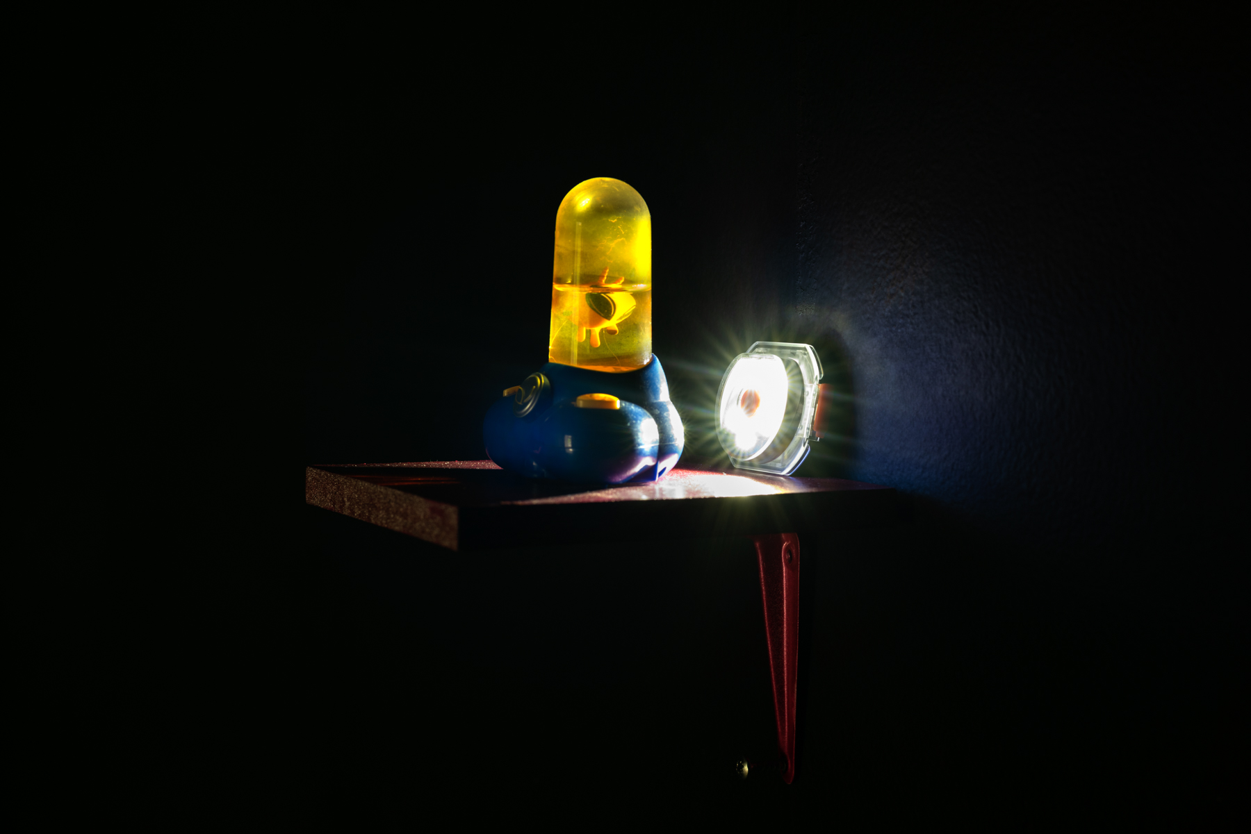 Within the main space it is hard to ignore the stories that reach out toward each other. The little girl with wild red hair is now a third reproduction. The original digital sketch was made into a cute wearable badge by Rudjord’s mother. The badge has been copied on a slight tilt to reveal an absence of colour to the right of the canvas, recalling directly a sense that all stories are repeated. The small girl in painterly largescale now transfixes her omniscient gaze, toward the violent death of the seated woman, perpetually smited by a bright yellow lighting bolt from above, the girl trapped in an unblinkable loop of witness.