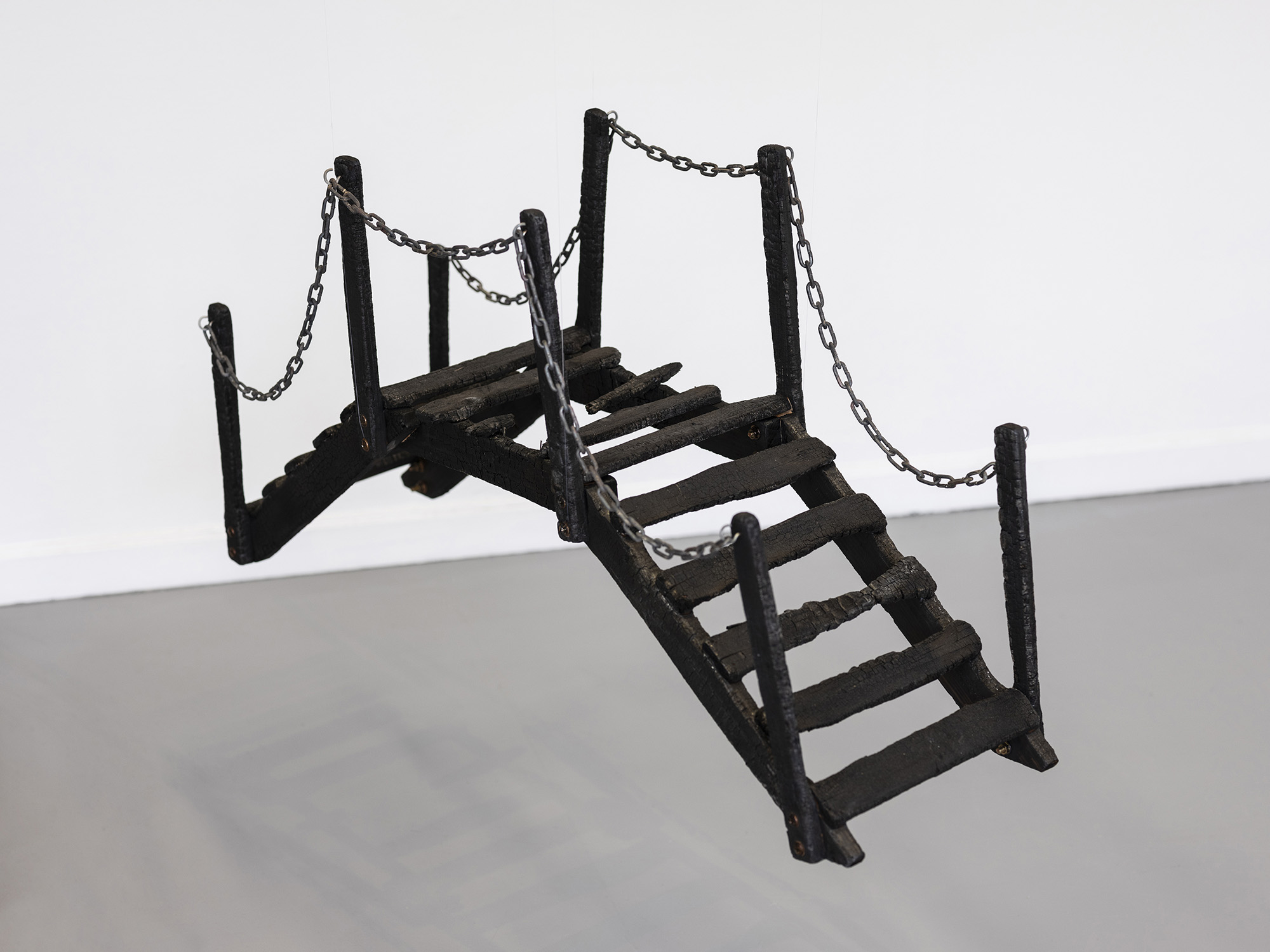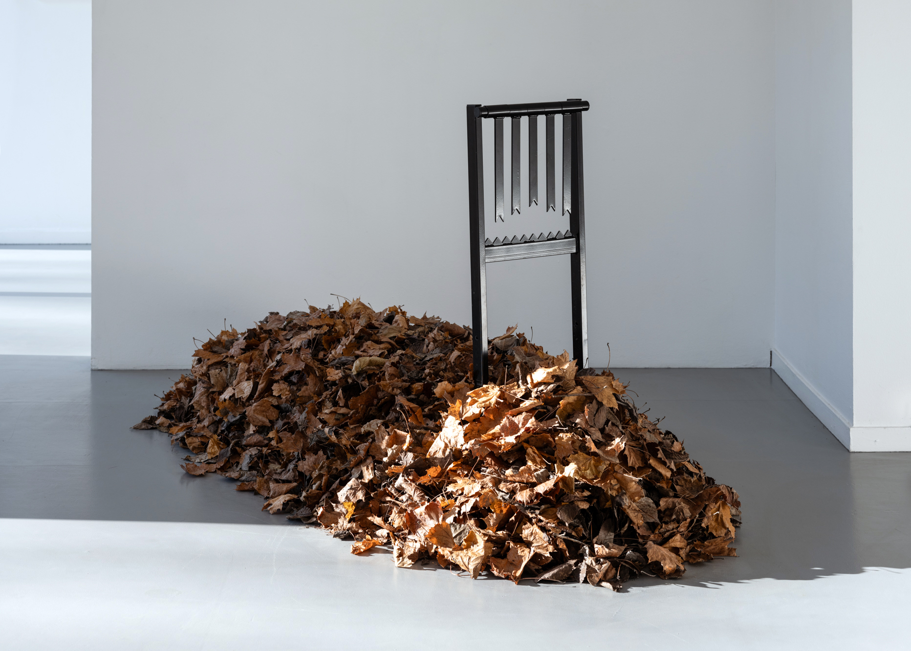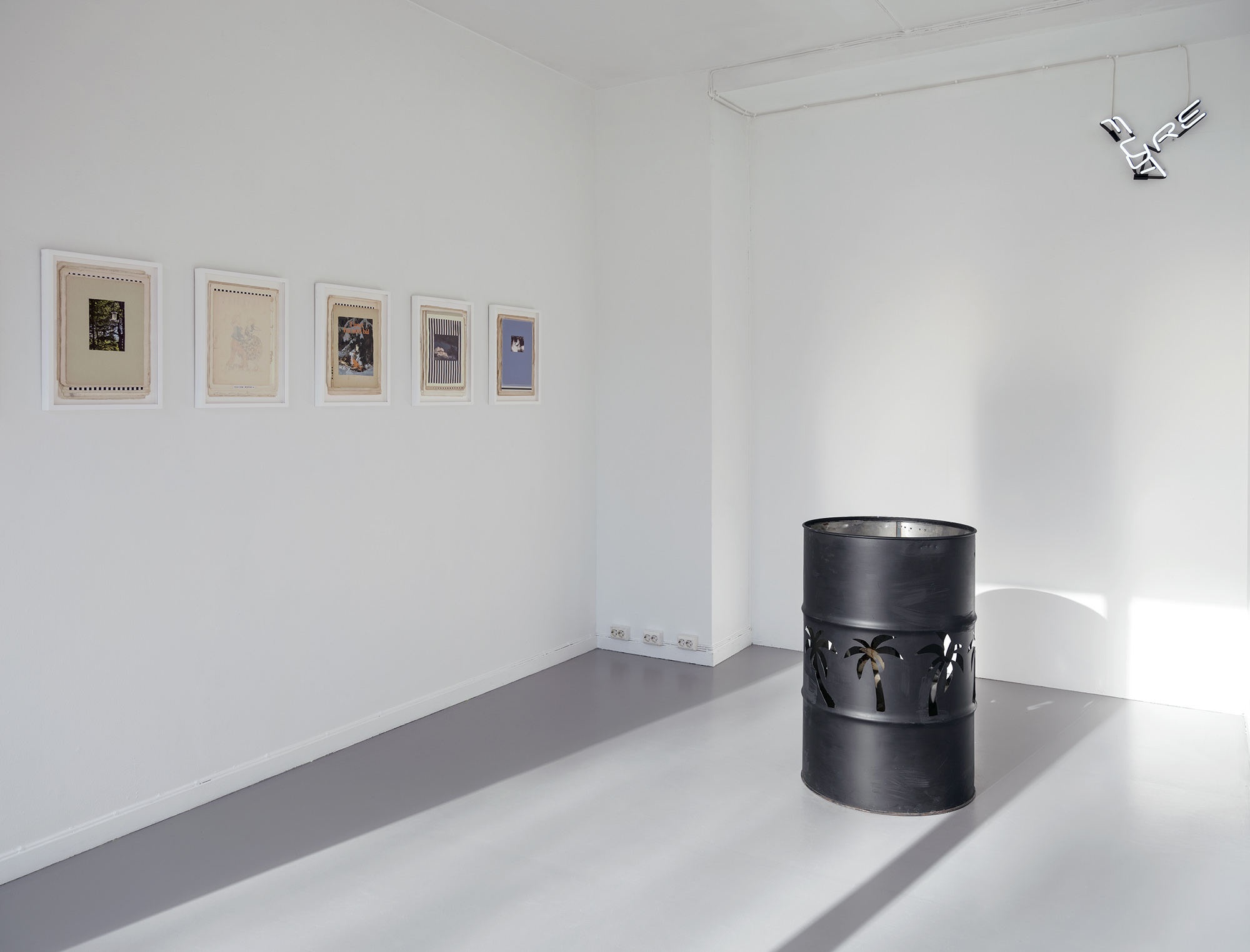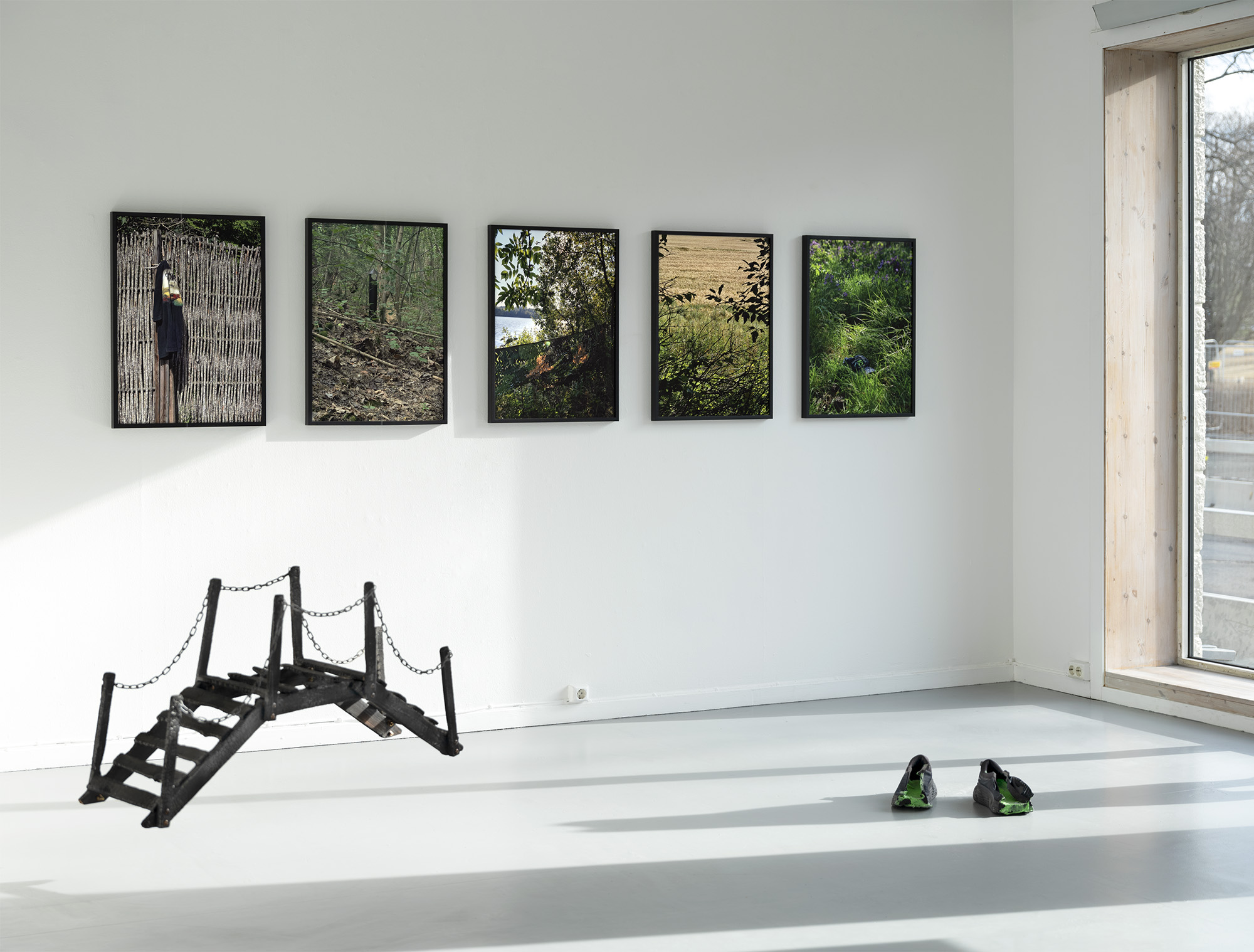 «Vinterlys» (“Winter Light”) is the title of both the exhibition and the only work produced in 2024. The remaining works were made in the period 2018–2022, and were shown under the title «Sank løv til et leie og kvist til et bål» (“Gather leaves for a bed and twigs for a campfire”). The works attempt to say something about what it means to be ready for the future today, mentally, ethically and in terms of preparedness. The exhibition reflects my own fears of a life turned upside down by war or escalating climate change. «Sank løv til et leie og kvist til et bål» was meant to be my farewell exhibition to this black-painted mindset, both in my life and in my art. The desire for a constructive change of focus arose when I was about to become a father to a little girl, and I saw the necessity of untangling myself from the dystopian bubble that had long put a damper on my hopes and dreams for the future. Two years later, the world has become a darker place. But the light that my daughter and the new family life provides, is reflected in me.